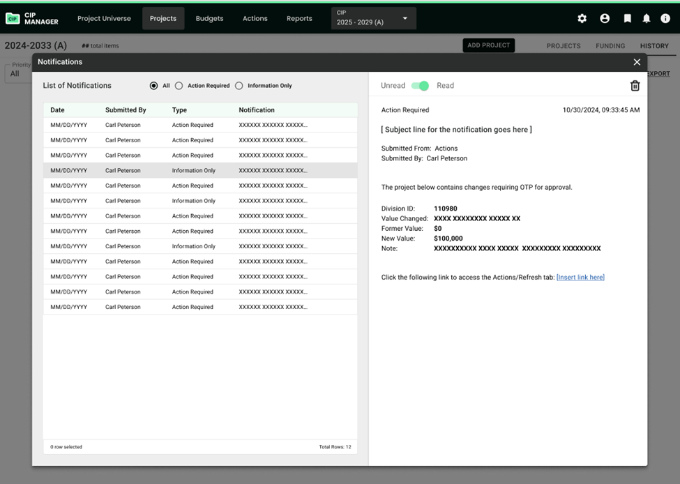 | Pending Project Refreshes Queued for Approval | Action Required | CIP Projects | Pending Project Refresh Queued for Review | You have pending project refreshes queued for approval. | Please review the Project Refresh tab and complete queued actions promptly to avoid data loss or overwrites. |