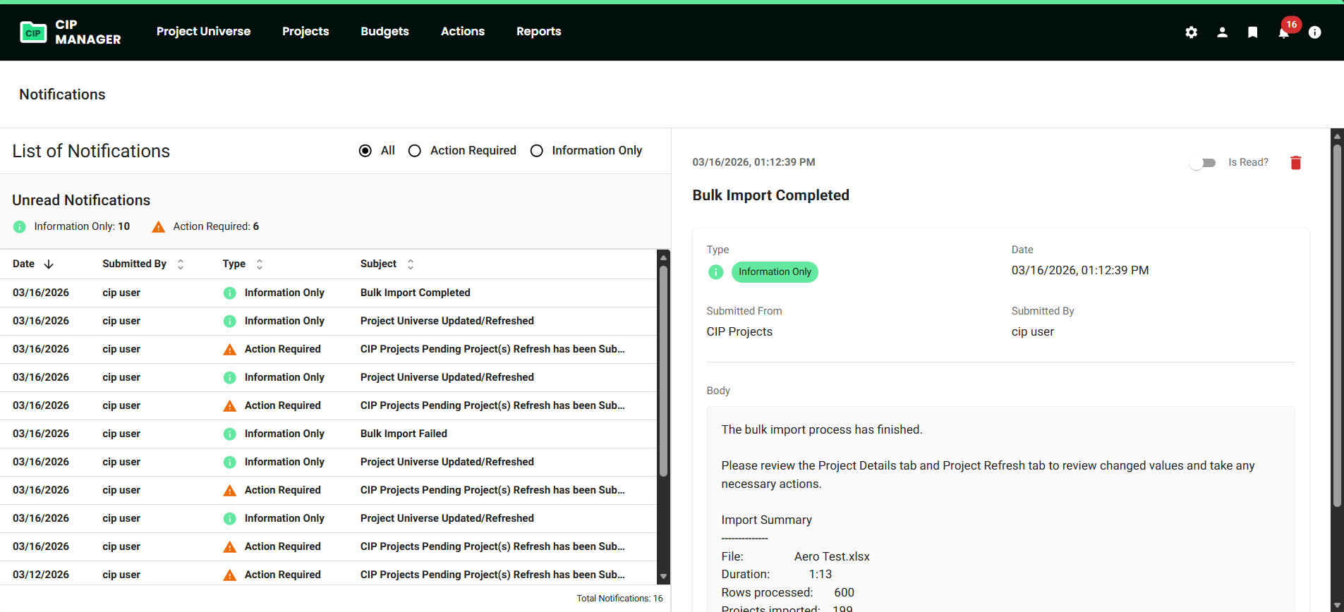 | Bulk Import has been Successfully Completed | Information Only | CIP Projects | Bulk Import Completed | The bulk import process has finished successfully. | Please review the Project Details tab and Project Refresh tab to review changed values and take any necessary actions. |
